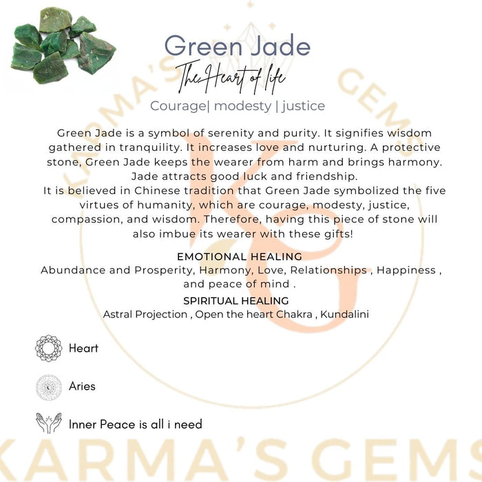 The Green Jade gemstone brings calm, peace and serenity. It harmonizes and balances internally. It is a gemstone which protects from harm, helps to release negative energies and irritability.