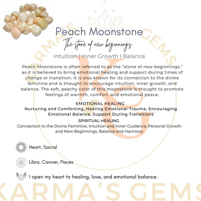 Peach moonstone has long been known for its calming, soothing qualities on the emotional body. Its energy is balancing and healing, assisting in the mastery of emotions by bringing them under the control of Higher Will, rather than expressing or repressing them.
