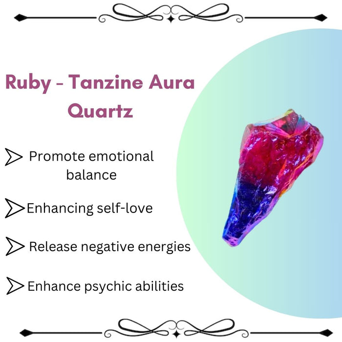 Tanzine Aura Quartz is known for its connection to higher spiritual realms and enhanced intuition. It helps expand your consciousness and deepens your connection to your higher self, divine wisdom, and spiritual guides.