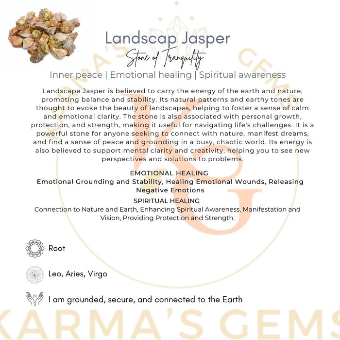 It encourages spirituality and is beneficial to meditation, helping to align meridians and chakras. Its powerful earth energy of comforting warmth brings harmony and spiritual rest. Landscape jasper stone call for our creativity.